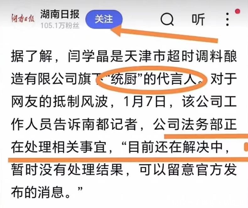 11. 随之而来的是商业信任的彻底瓦解。她代言长达十余年的国民调味品牌“统厨”遭遇严重信誉危机,市场反应剧烈,产品销量断崖式下滑。