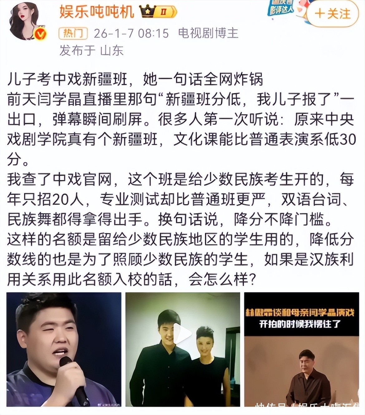 又一个那尔那茜?闫学晶事件升级,儿子新疆班惹争议,中戏受牵扯
